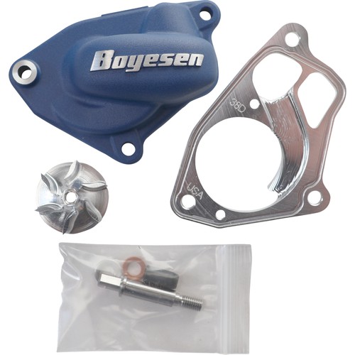 The Boyesen Super Cooler water pump kit is an aluminum investment cast water pump cover and impeller combo; specifically designed to enhance the performance of your engines cooling system. This high flow, hydrodynamic water pump kit has been tested and designed to flow more coolant. By increasing the flow, the engine will run cooler at a more constant temperature.